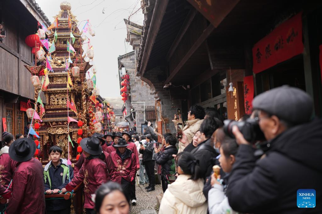 Dorfbewohner und Touristen nehmen an der Laternenfestparade in der Stadt Qiantong im Kreis Ninghai in der ostchinesischen Provinz Zhejiang teil. (Foto vom 23. Februar 2024, Xinhua/Weng Xinyang)