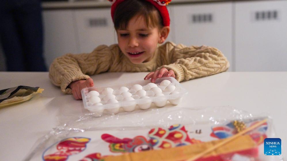 Die Tochter von Sascha Schürrer betrachtet ihre „Tangyuan“, süße Klebreisknödel, zu Hause in Changchun, nordostchinesische Provinz Jilin, am 23. Februar 2024. (Xinhua/Yan Linyun)