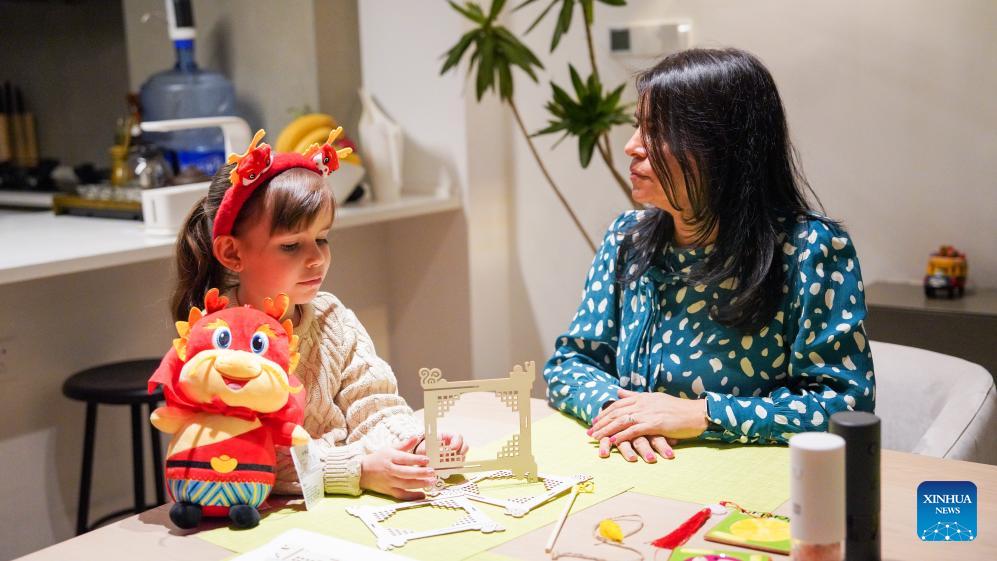 Johanna Garzon-Schürrer (R) und Tochter basteln zu Hause in Changchun, Provinz Jilin im Nordosten Chinas, eine Laterne, 23. Februar 2024. (Xinhua/Yan Linyun)