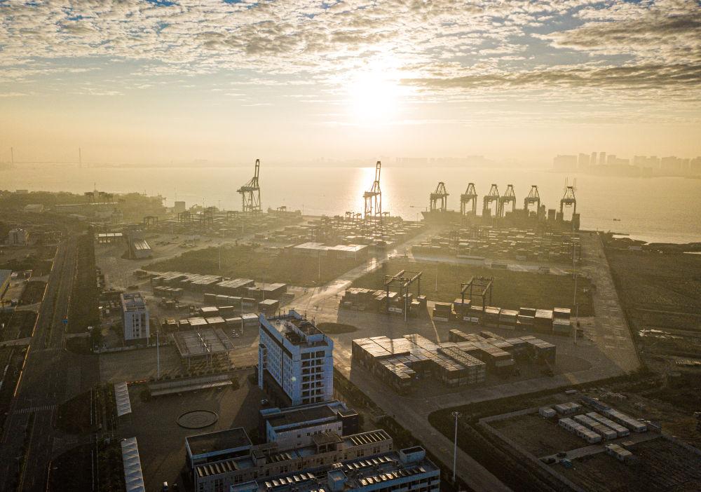 Das Yangpu International Container Terminalin in der Wirtschaftszone Yangpu in der Provinz Hainan, ein Containerschifffahrtsknotenpunkt des Freihandelshafens Hainan. (Foto vom 1. Januar 2024, Pu Xiaoxu/Xinhua)