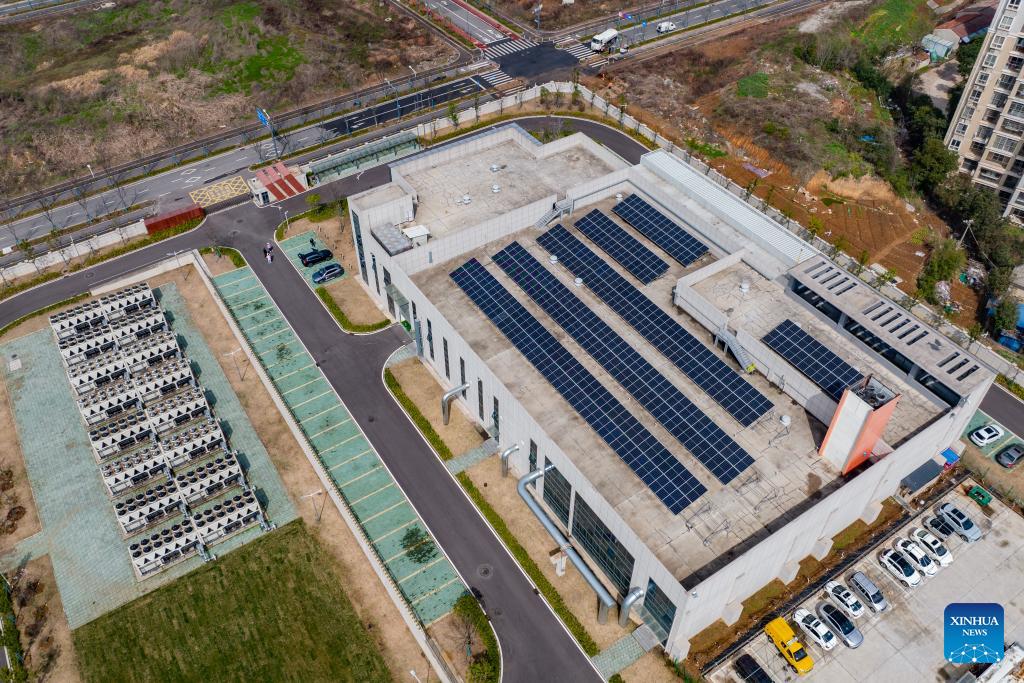 Eine Drohnenaufnahme zeigt die Energiestation des Start-up-Bereichs der chinesisch-französischen Öko-Demonstrationsstadt in Wuhan. (Foto vom 19. März 2024, Xinhua/Wu Zhizun)