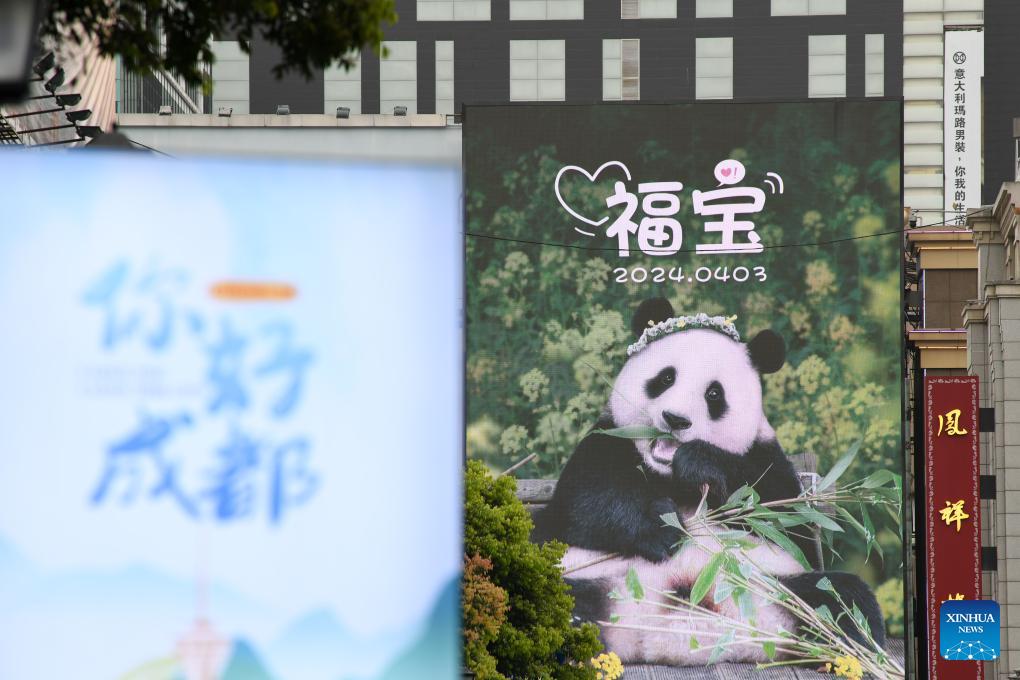 Dieses Foto zeigt einen Bildschirm mit einem Foto des Riesenpandas Fu Bao in einer Geschäftsstraße in Chengdu. (Xinhua/Xu Bingjie)