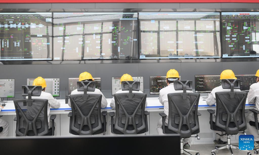 Mitarbeiter arbeiten in der 300-MW-Druckluftspeicherstation in Yingcheng. (Foto vom 9. April 2024 , Xinhua/Cheng Min)