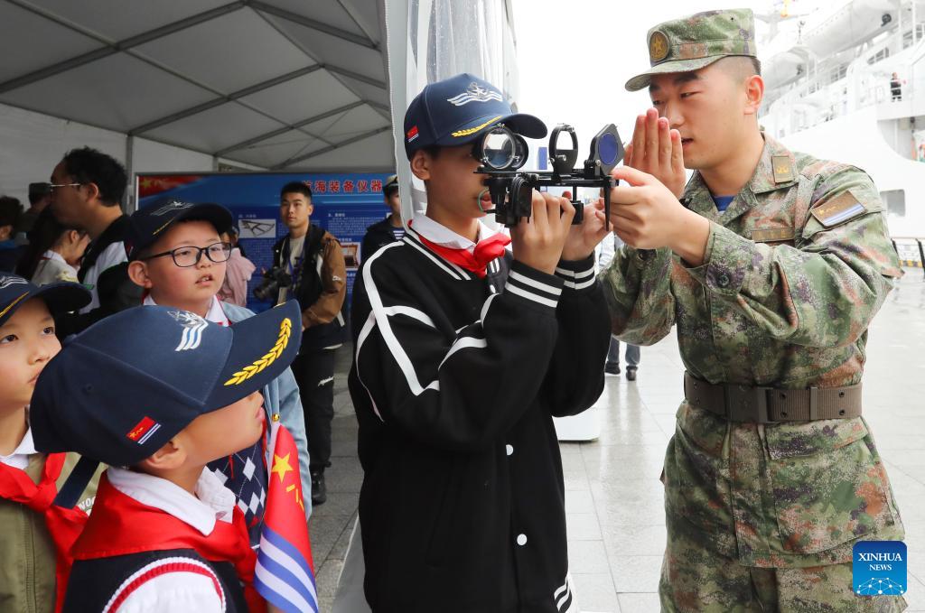 Ein Grundschüler probiert während des Tages der offenen Tür in einem Hafen in Shanghai unter der Anleitung eines Marinesoldaten den Sextanten aus. (Foto vom 23. April 2024, Xinhua/Fang Zhe)