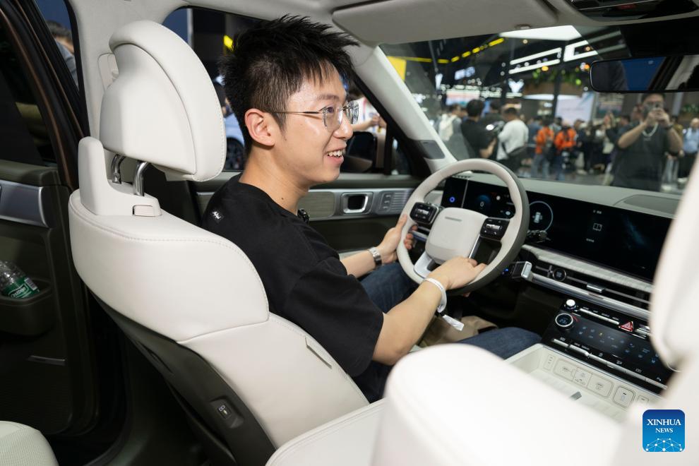 Ein Besucher probiert einen Hyundai Santafe Geländewagen auf der Internationalen Automobilausstellung 2024 in Beijing aus. (Foto vom 25. April 2024, Xinhua/Cai Yang)