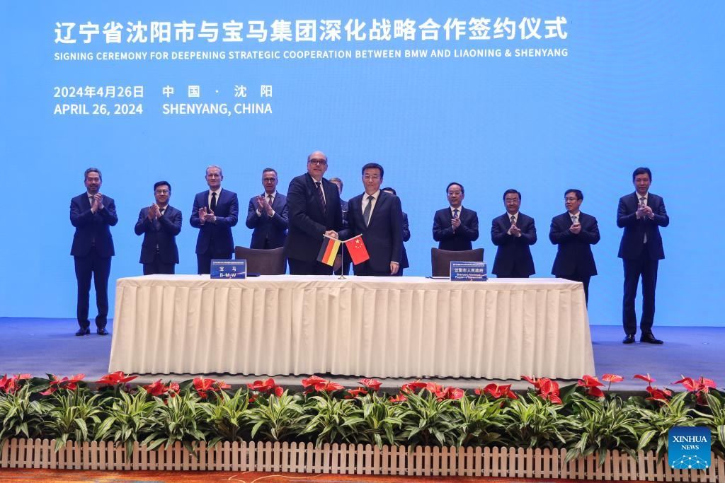 Unterzeichnungszeremonie zur Vertiefung der strategischen Zusammenarbeit zwischen BMW und Shenyang in Shenyang am 26. April 2024. (Xinhua/Pan Yulong)