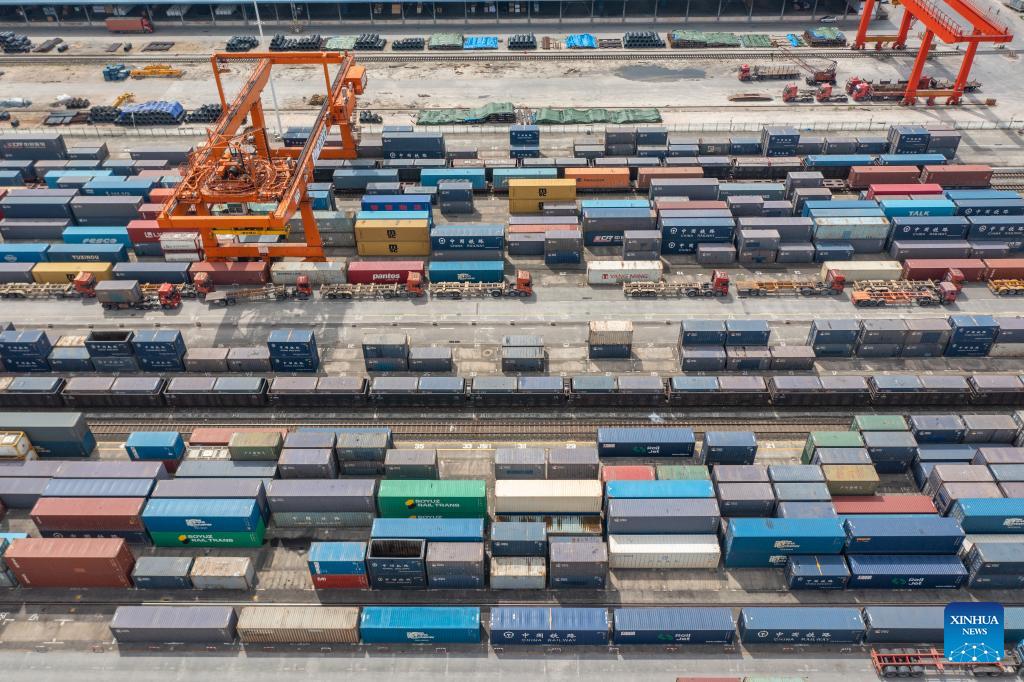Die Drohnenaufnahmezeigt Lastwagen, die am Bahnhof Tuanjiecun im Chongqing International Logistics Hub Park fahren. (Foto vom 5. Mai 2024, Xinhua/Huang Wei)