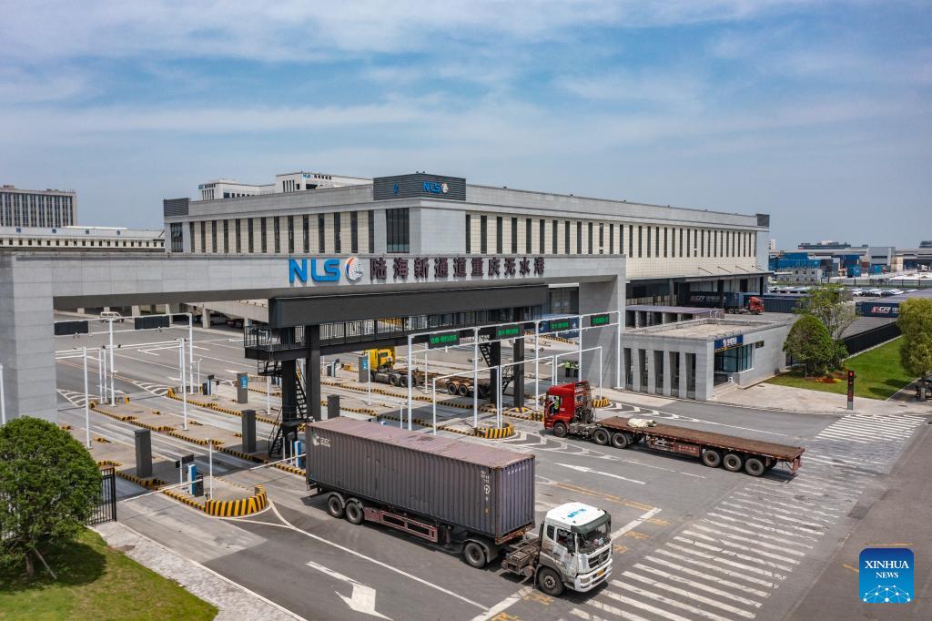 Die Drohnenaufnahme zeigt Lastwagen im Trockenhafen des Neuen Internationalen Land-See-Handelskorridors in der südwestchinesischen Stadt Chongqing. (Foto vom 5. Mai 2024, Xinhua/Huang Wei)
