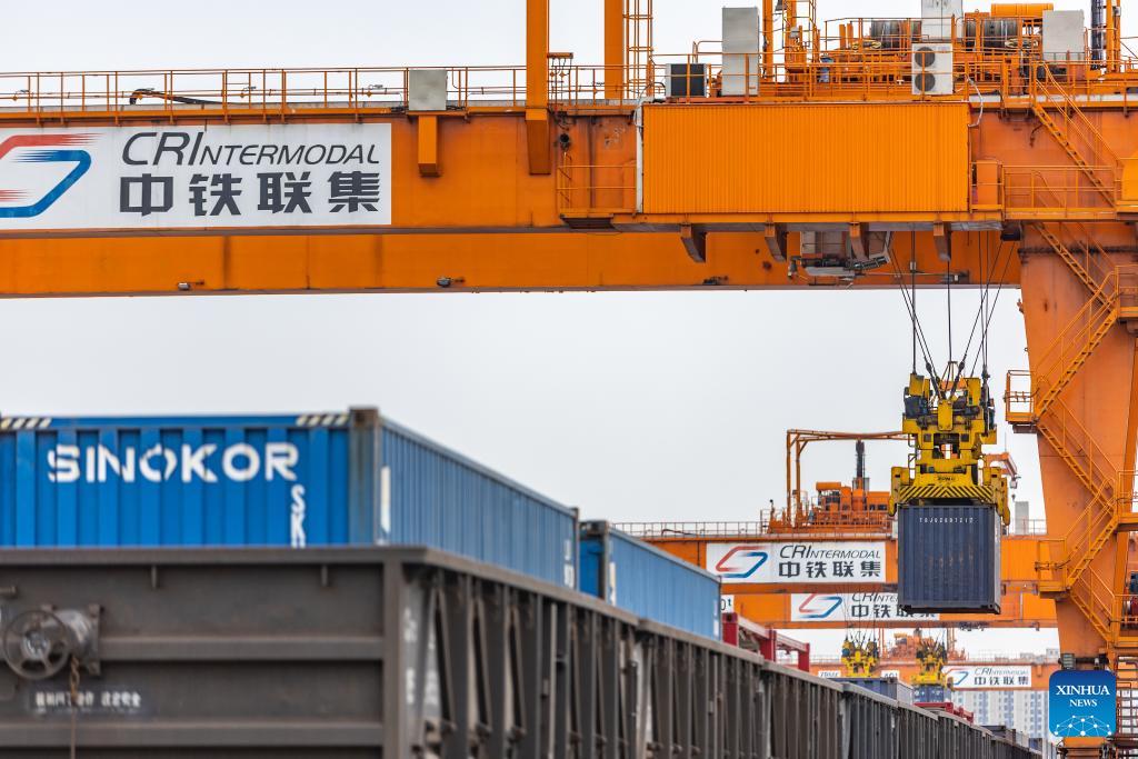 Ein China-Europa-Güterzug wird im Tuanjiecun-Bahnhof im Chongqing International Logistics Hub Park beladen. (Foto vom 5. Mai 2024, Xinhua/Huang Wei)