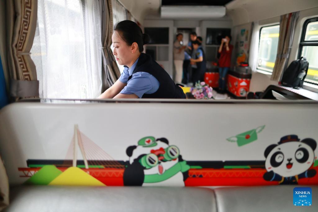Zugbegleiter bereiten einen „Panda-Zug“ in Guiyang vor. (Foto vom 7. Mai 2024, Xinhua/Liu Xu)