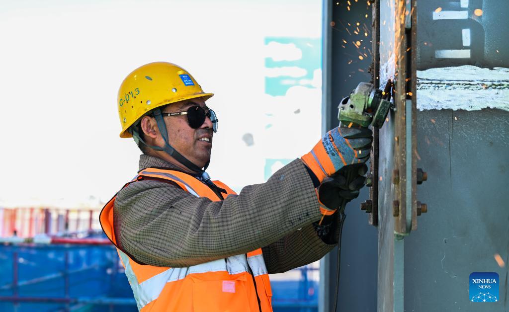 Arbeiter sind auf der Baustelle eines Flugsicherungsturms in Hohhot zu sehen. (Foto vom 8. Mai 2024, Xinhua/Liu Lei)