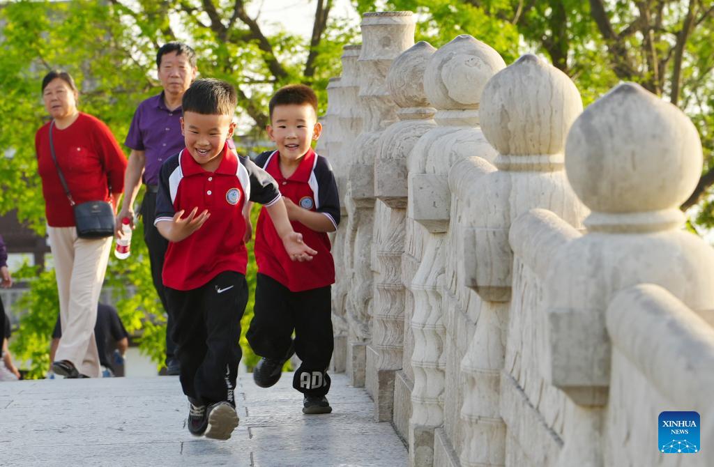 Kinder spielen auf der Zhaozhou-Brücke. (Foto vom 24. April 2024, Xinhua)