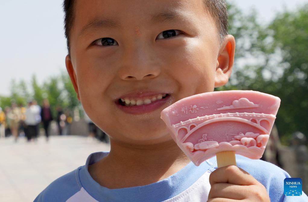 Ein Kind zeigt ein Eis mit einem Muster der Zhaozhou-Brücke. (Foto vom 25. April 2024, Xinhua)