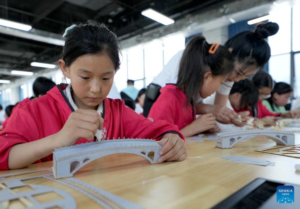 Grundschüler im Kreis Zhaoxian fertigen Modelle der Zhaozhou-Brücke an. (Foto vom 25. April 2024, Xinhua)