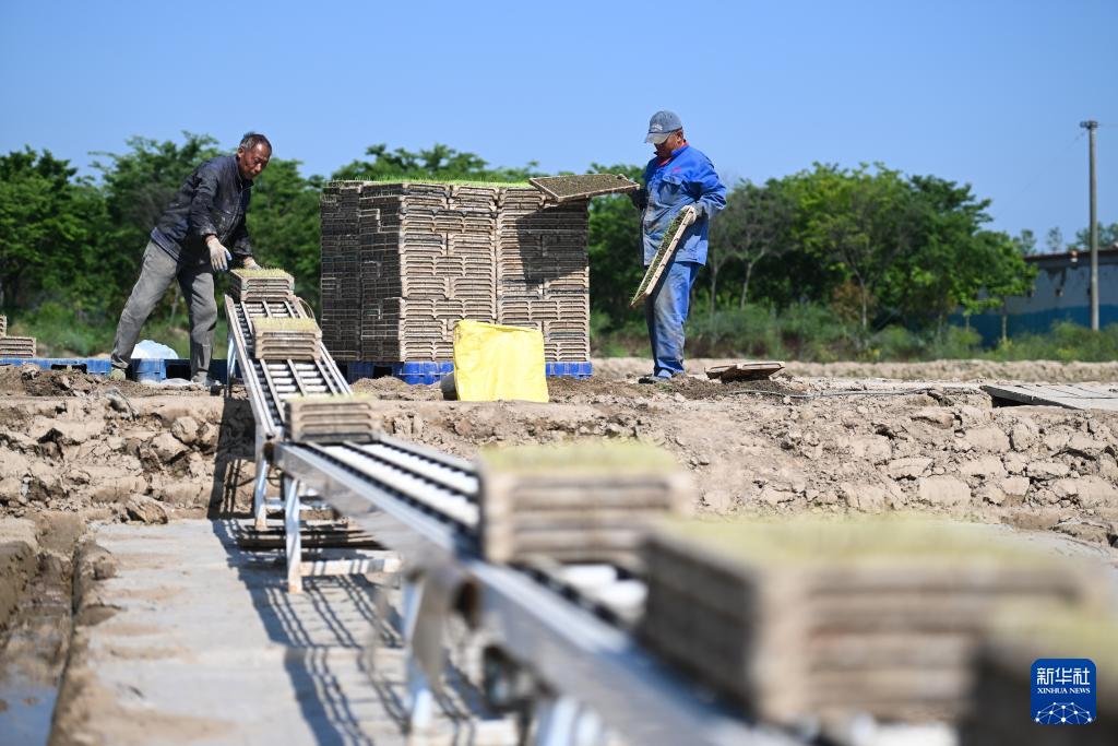 Die Bauern der Genossenschaft für Agrarmaschinen im Kreis Sheyang legen die Platten auf den Laufband. (Foto vom 8. Mai, Ji Chunpeng/Xinhua)