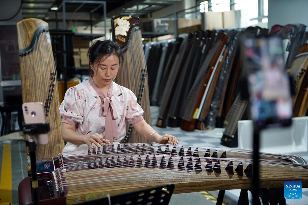Eine Mitarbeiterin verkauft Guzheng über Livestreaming. (Foto vom 13. Mai 2024, Xinhua/Hao Yuan)