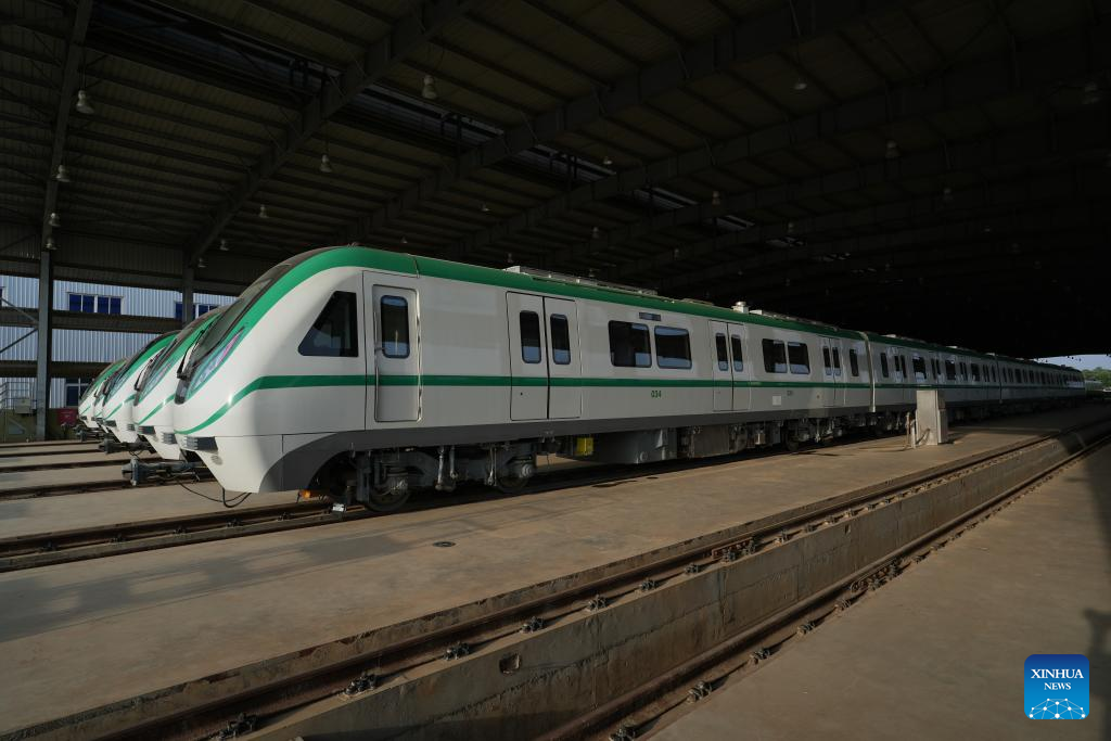 Das Foto zeigt die in China hergestellten Elektrotriebzüge (EMU) in einem Depot in Abuja, Nigeria. (Foto vom 28. Mai 2024, Xinhua/Yang Zhe)