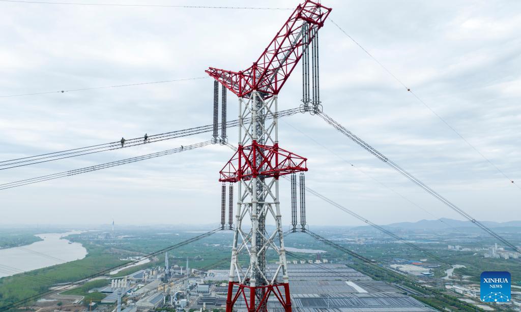 Mit einer Länge von 2.080 Kilometern überspannt diese Ultrahochspannungs-Gleichstrom-Übertragungsleitung in Anhui den Jangtse-Fluss. Über diese Leitung werden jährlich über 30 Milliarden kWh sauberer Strom übertragen. (10. April 2024, Xinhua)