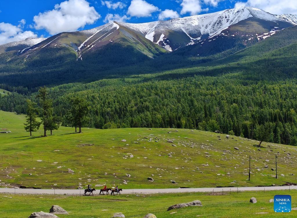 Touristen reiten im Kreis Habahe in Altay im nordwestchinesischen Uigurischen Autonomen Gebiet Xinjiang auf Pferden. Im Mai verzeichnete Altay 4,15 Millionen Touristenreisen und 3,65 Milliarden Yuan an Tourismuseinnahmen, was einem Anstieg von 60,81 Prozent bzw. 88,25 Prozent gegenüber dem Vorjahr entspricht. (4. Juni 2024, Xinhua)