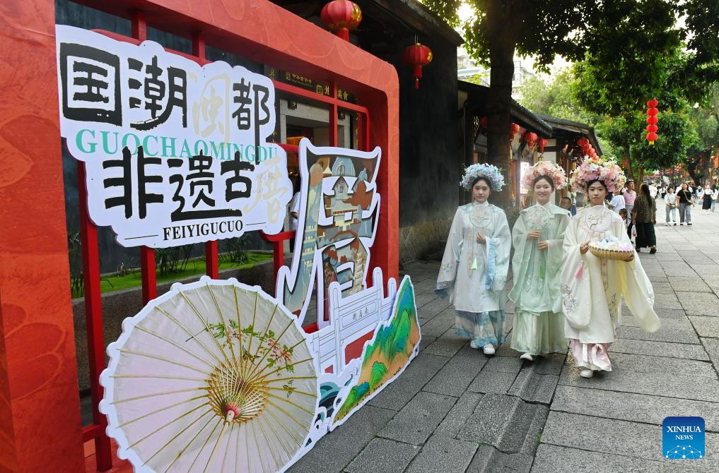 Touristen mit Blumenkopfschmuck spazieren durch das antike Viertel Sanfangqixiang (auf Deutsch: „Drei Gassen und sieben Alleen“) in Fuzhou in der südostchinesischen Provinz Fujian. Die Stadtverwaltung von Fuzhou hat in den letzten Jahren verschiedene Maßnahmen ergriffen, um alte Gebäude und Strukturen in der Stadt zu schützen. Diese Stätten dienen auch als Touristenattraktionen und tragen somit dazu bei, den lokalen Tourismussektor anzukurbeln. (7. Juni 2024, Xinhua)