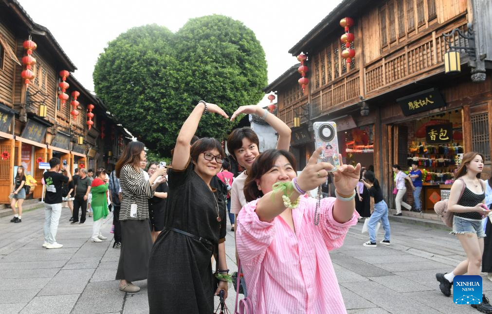 Touristen posieren für Selfies vor einem herzförmigen Baum in einer Straße im Sanfangqixiang-Gebiet. (7. Juni 2024, Xinhua)