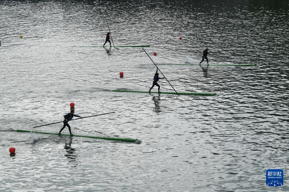 Wettbewerber balancieren auf dünnen Bambuspfählen und rudern entlang einem Fluss in Zhenyuan. (12. Juni 2024, Xinhua)
