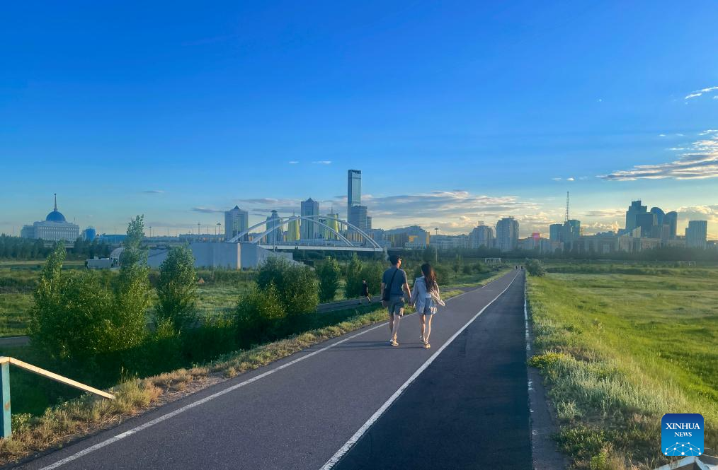Menschen machen einen Spaziergang in einem Park in Astana. (29. Juni 2024, Xinhua)