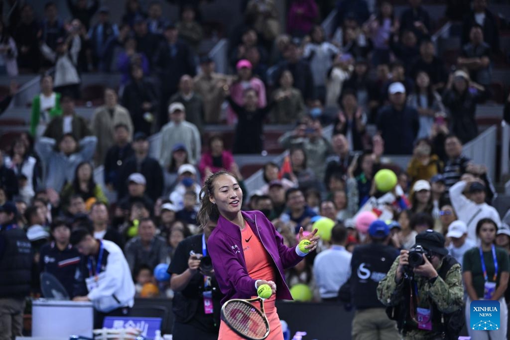 Zheng Qinwen schlägt signierte Bälle beim Tennisturnier 2024 China Open in Beijing ins Publikum. (4. Oktober 2024, Xinhua)