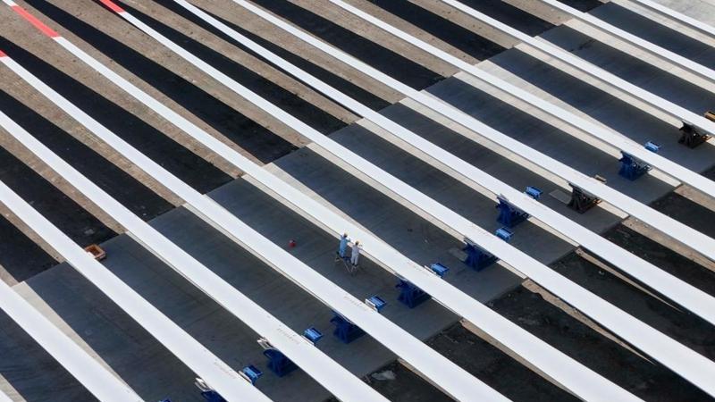 Das Drohnenfoto zeigt Arbeiter bei der Überprüfung von Windturbinenflügeln in einem Industriepark in der nordwestchinesischen Uigurischen Autonomen Region Xinjiang. (Foto vom 10. September 2024, Xinhua)