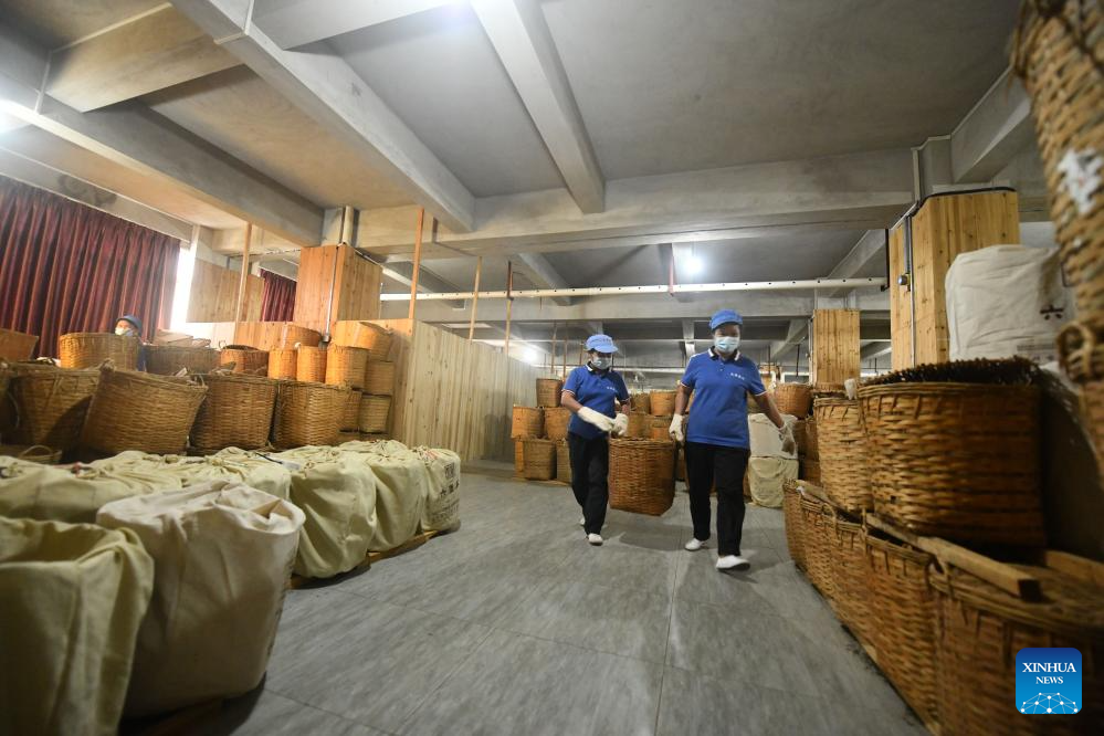 Arbeiter lagern am 25. Oktober 2024Tee in einem Unternehmen in Wuzhou in der südchinesischen Autonomen Region Guangxi der Zhuang. (Xinhua/Huang Xiaobang)