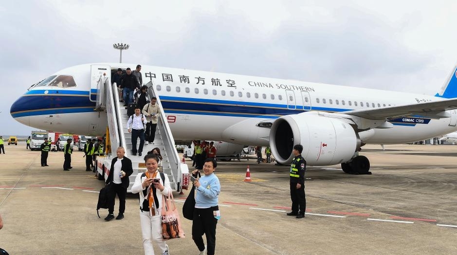 Ein Flugzeug vom Typ C919 landet auf dem Haikou Meilan International Airport. (11. Dezember 2024, Xinhua)