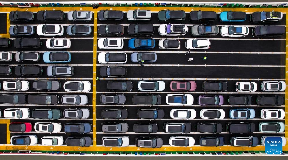 Ein Drohnenfoto zeigt eine Fähre mit Fahrzeugen mit neuer Energie, die sich im Hafen von Xiuying, Stadt Haikou, auf die Überfahrt vorbereitet. (26. Januar 2025, Xinhua)