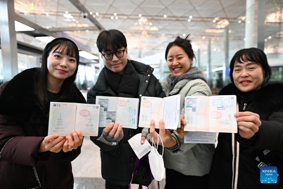 Touristen aus Südkorea zeigen am Beijing Capital International Airport die Einreisestempel in ihren Pässen. (28. Januar 2025, Xinhua)