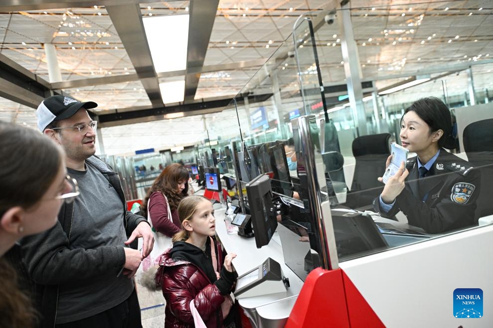 Die Einwanderungsbeamte Chen Miao (1. v. r.) kümmert sich am Beijing Capital International Airport um die Verfahren zum visafreien Transit für Touristen aus den USA. (28. Januar 2025, Xinhua)