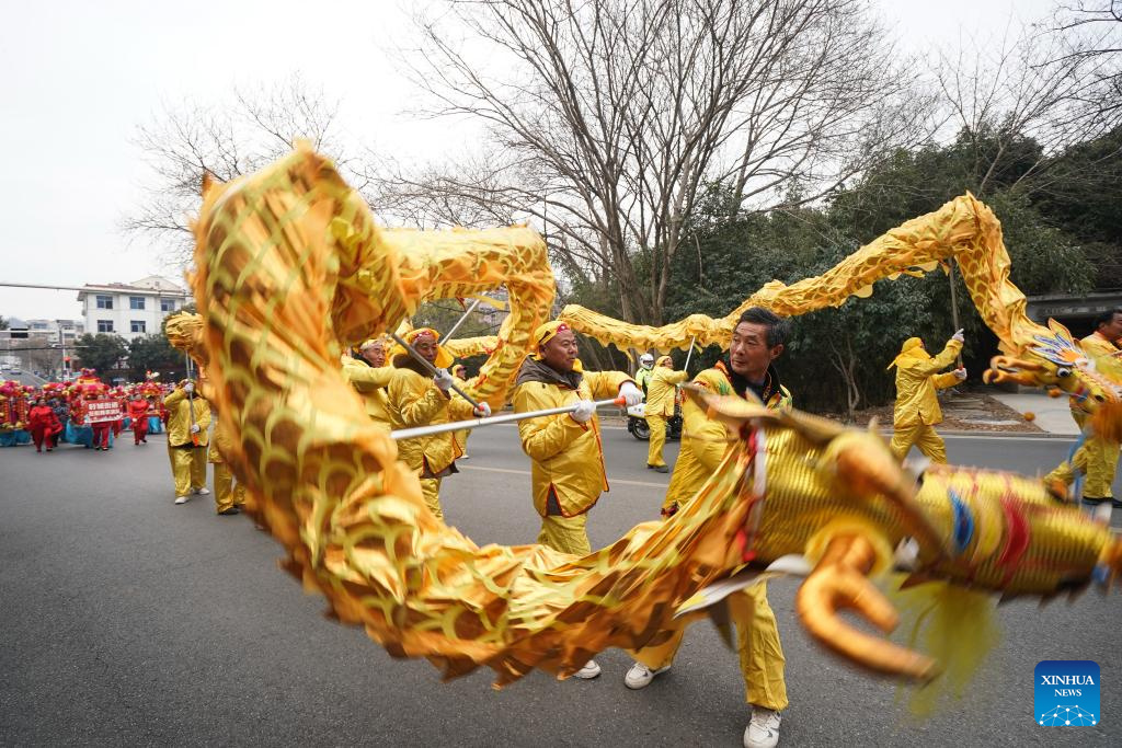 Künstler führen einen Drachentanz während einer Veranstaltung in der ostchinesischen Provinz Jiangsu auf. (Foto vom 11. Februar 2025, Xinhua/Ji Chunpeng)