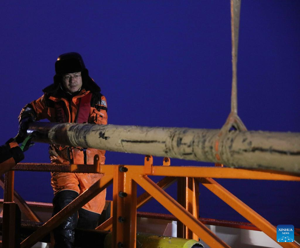 Ein Mitglied des 41. chinesischen Antarktis-Expeditionsteams demontiert am 10. Februar 2025 die Ausrüstung für die Sammlung von Meeressedimentproben an Bord des chinesischen Forschungseisbrechers Xuelong 2. (Foto von Xinhua/Huang Taoming)