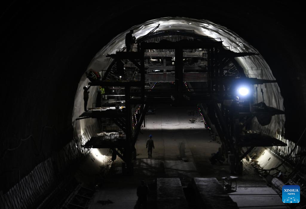 Arbeiter auf der Baustelle des Tongchuan-Tunnels entlang der Hochgeschwindigkeitsstrecke Xi'an-Yan'an in der nordwestchinesischen Provinz Shaanxi. (Foto vom 13. Februar 2025, Xinhua/Zhang Bowen)