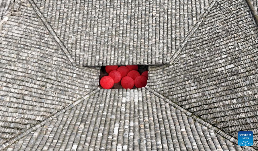 Frisch hergestellte Regenschirme aus Ölpapier werden in einem Hof gelüftet. (Xinhua/Liu Kun)