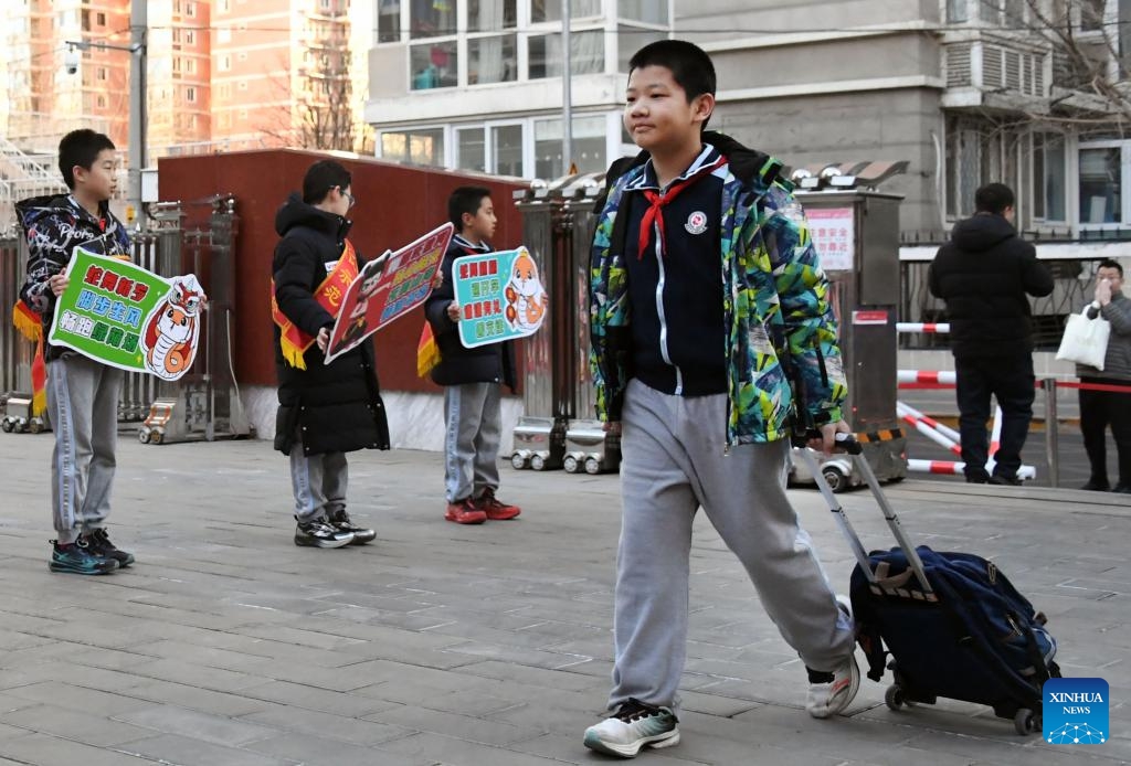 Ein Kind betritt eine Grundschule in der chinesischen Hauptstadt Beijing. (17. Februar 2025, Xinhua)