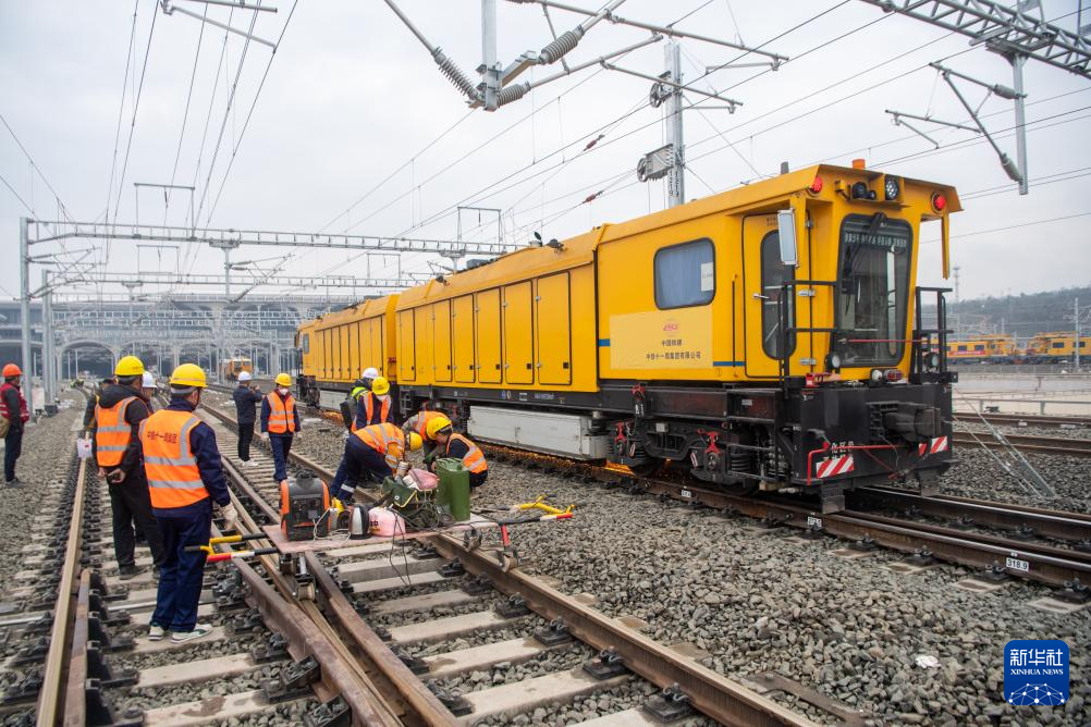 Arbeiter bei der Feineinstellung der Gleise am Ostbahnhof Chongqing. (Foto vom 19. Februar 2025, Tang Yi/Xinhua)
