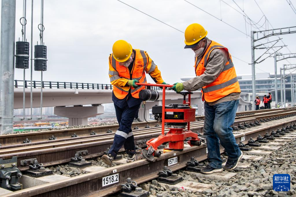 Arbeiter bei der Feineinstellung der Gleise am Ostbahnhof Chongqing. (Foto vom 19. Februar 2025, Tang Yi/Xinhua)