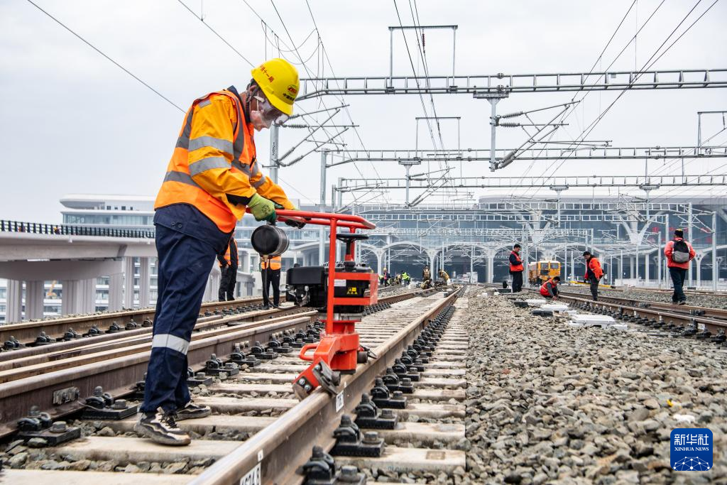 Arbeiter bei der Feineinstellung der Gleise am Ostbahnhof Chongqing. (Foto vom 19. Februar 2025, Tang Yi/Xinhua)