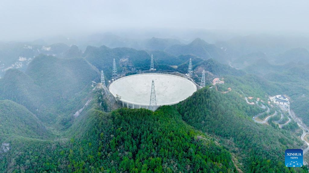 Die Luftaufnahme zeigt das chinesische sphärische Radioteleskop mit fünfhundert Metern Öffnung (FAST). (18. Februar 2025, Xinhua)