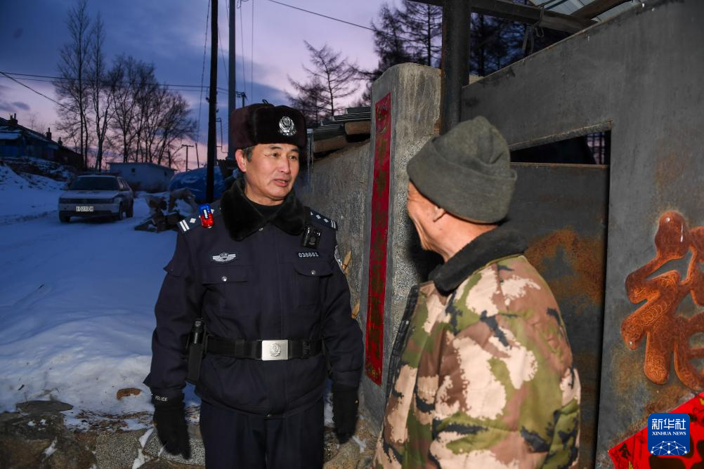 Yang (links) besucht die Anwohner entlang der Bahnstrecke in der Gemeinde Baishishan, Stadt Jiaohe, Provinz Jilin. (Foto vom 18. Februar 2025, Foto vom Zhang Nan/Xinhua)