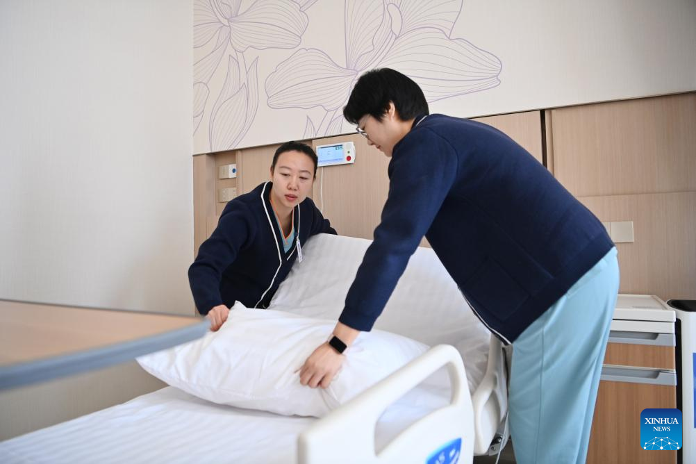 Krankenschwestern räumen ein Bett im Perennial General Hospital Tianjin auf. (Foto vom 26. Februar 2025, Xinhua/Li Ran)