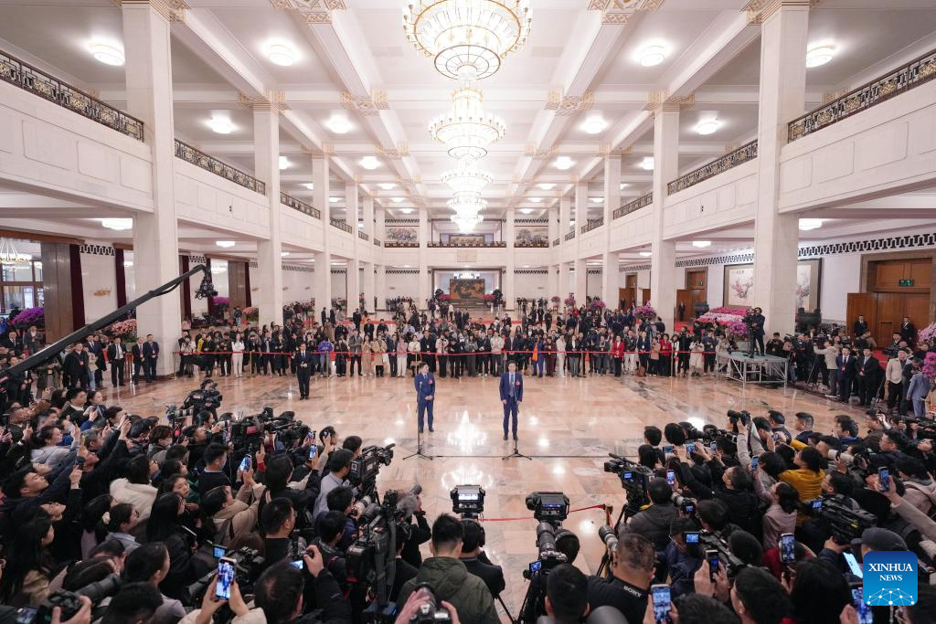 Abgeordnete des 14. Nationalen Volkskongresses (NVK) nehmen an einem Gruppeninterview vor der Eröffnung der dritten Tagung des 14. NVK in der Großen Halle des Volkes in Beijing teil. (Foto vom 5. März 2025, Xinhua/Zheng Huansong)