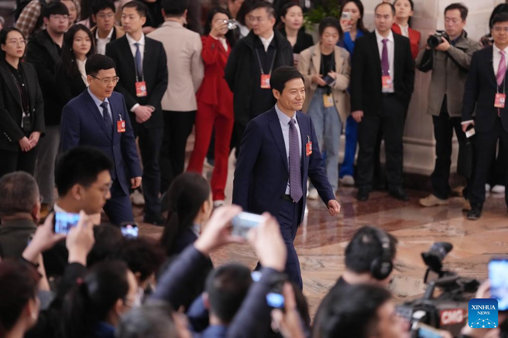 Abgeordnete des 14. Nationalen Volkskongresses (NVK) nehmen an einem Gruppeninterview vor der Eröffnung der dritten Tagung des 14. NVK in der Großen Halle des Volkes in Beijing teil. (Foto vom 5. März 2025, Xinhua/Zheng Huansong)