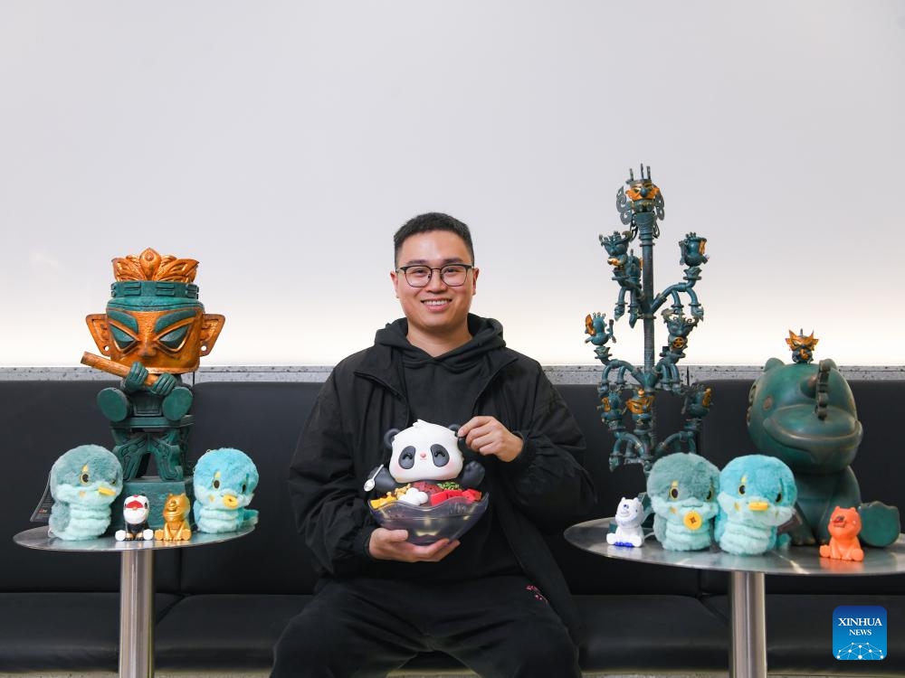 Zeng Zhou posiert für Fotos mit einigen der von ihm entworfenen kulturellen Kreativprodukte. (1. März 2025, Xinhua)