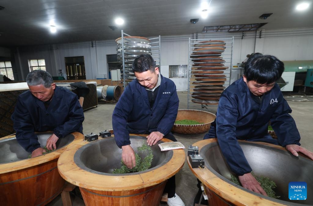 Menschen verarbeiten Teeblätter in der Werkstatt eines Teegartens. (5. März 2025, Xinhua)