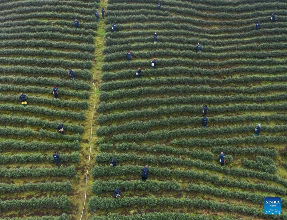 Bauern pflücken Teeblätter in einem Teegarten im Kreis Wuyi. (5. März 2025, Xinhua)